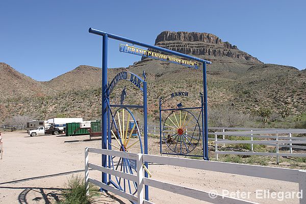 Grand Canyon West Ranch gate and sign with Spirit Mountain behind